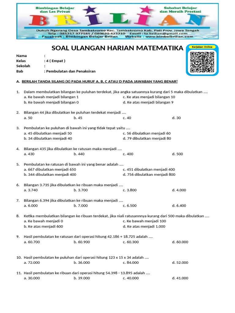 Penaksiran adalah keterampilan fundamental yang membantu siswa kelas 4 SD memahami dunia angka di sekitar mereka dengan lebih baik. Bukan sekadar menebak, penaksiran melibatkan pemahaman konsep pembulatan dan perkiraan untuk mendapatkan gambaran umum tentang nilai suatu bilangan atau hasil perhitungan. Kemampuan ini sangat penting untuk membuat keputusan sehari-hari, mulai dari memperkirakan jumlah uang belanja hingga memperkirakan waktu tempuh. Artikel ini akan membahas secara mendalam tentang latihan soal penaksiran yang cocok untuk siswa kelas 4 SD, dilengkapi dengan contoh-contoh konkret dan strategi untuk mempermudah pemahaman.
